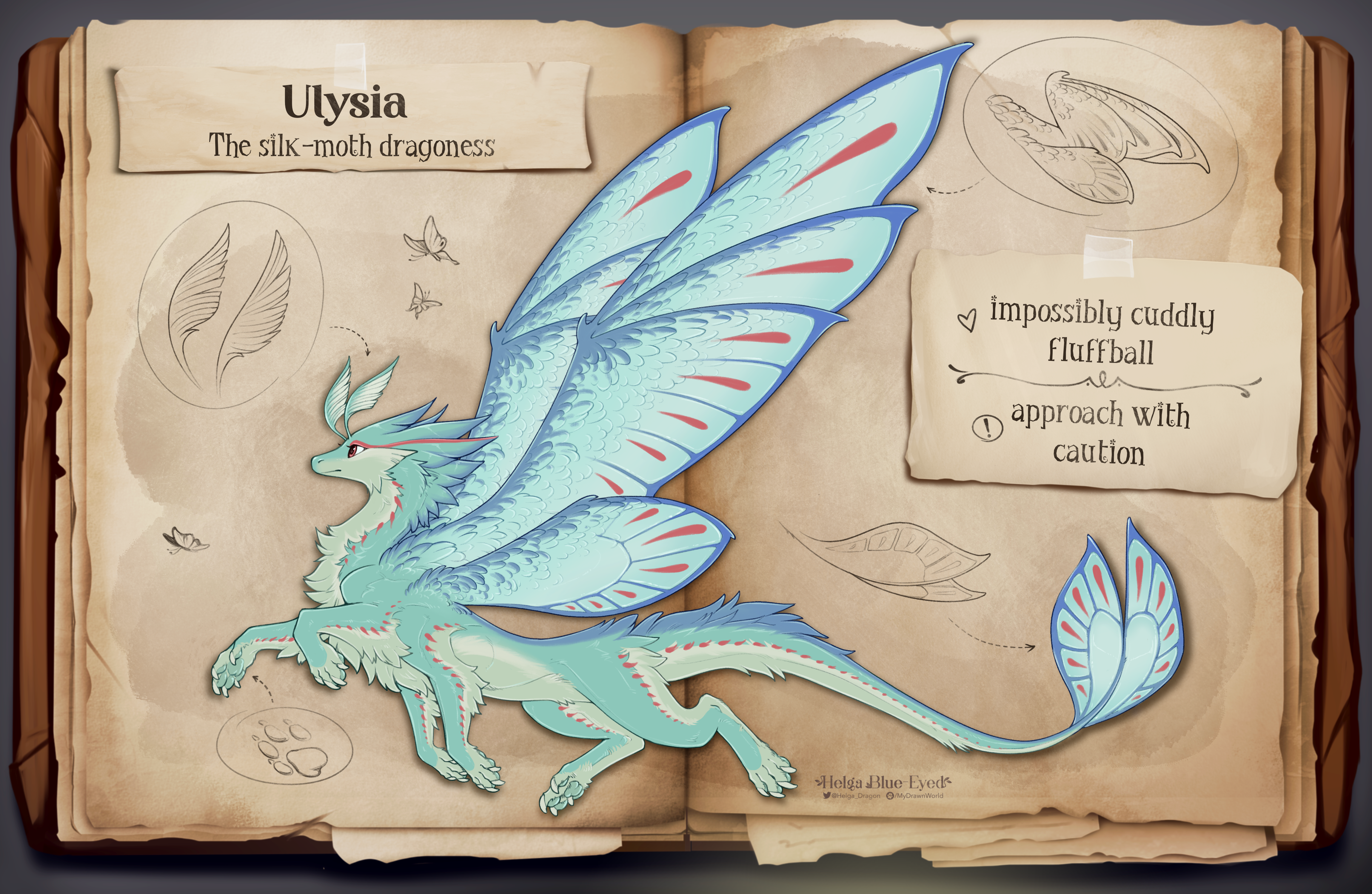 Ulysia is a moth-dragon hybrid. She can squeak like a deathhead hawkmoth and retains her silk abilities from previous iteration. She is very soft and likes to snuggle.
